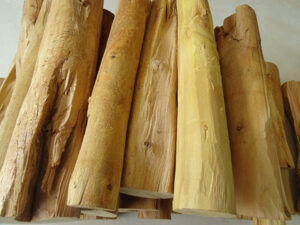 This product consists of cylindrical pieces of wood of varying lengths, some slightly curved, generally about 1 meter long and 10 to 30 cm in diameter. Its outer surface is grayish-yellow or yellowish-brown, smooth and delicate, sometimes with knots or longitudinal cracks. Its cross-section is brownish-yellow with traces of oil. Brown growth rings may be noticeable or indistinct, and the grain is straight when split longitudinally. It is firm and resistant to breaking. It has a delicate aroma that intensifies when burned. Its flavor is mild, with a slightly spicy taste when chewed.