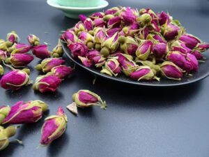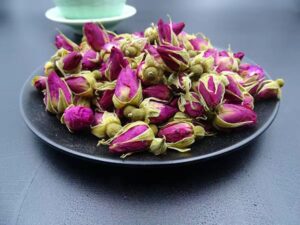 The dried flowers are slightly hemispherical or irregularly shaped, 1.5 to 2 cm in diameter. The petals are densely packed, short, and round, with a vibrant purple-red color. A yellow stamen lies in the center, and a green calyx, split into five lobes at the tip, is located below. A swollen, spherical receptacle is located at the bottom. The texture is light and brittle. The aroma is rich and slightly bitter. Preferred flowers are large, thick, bright purple, and have a strong aroma.